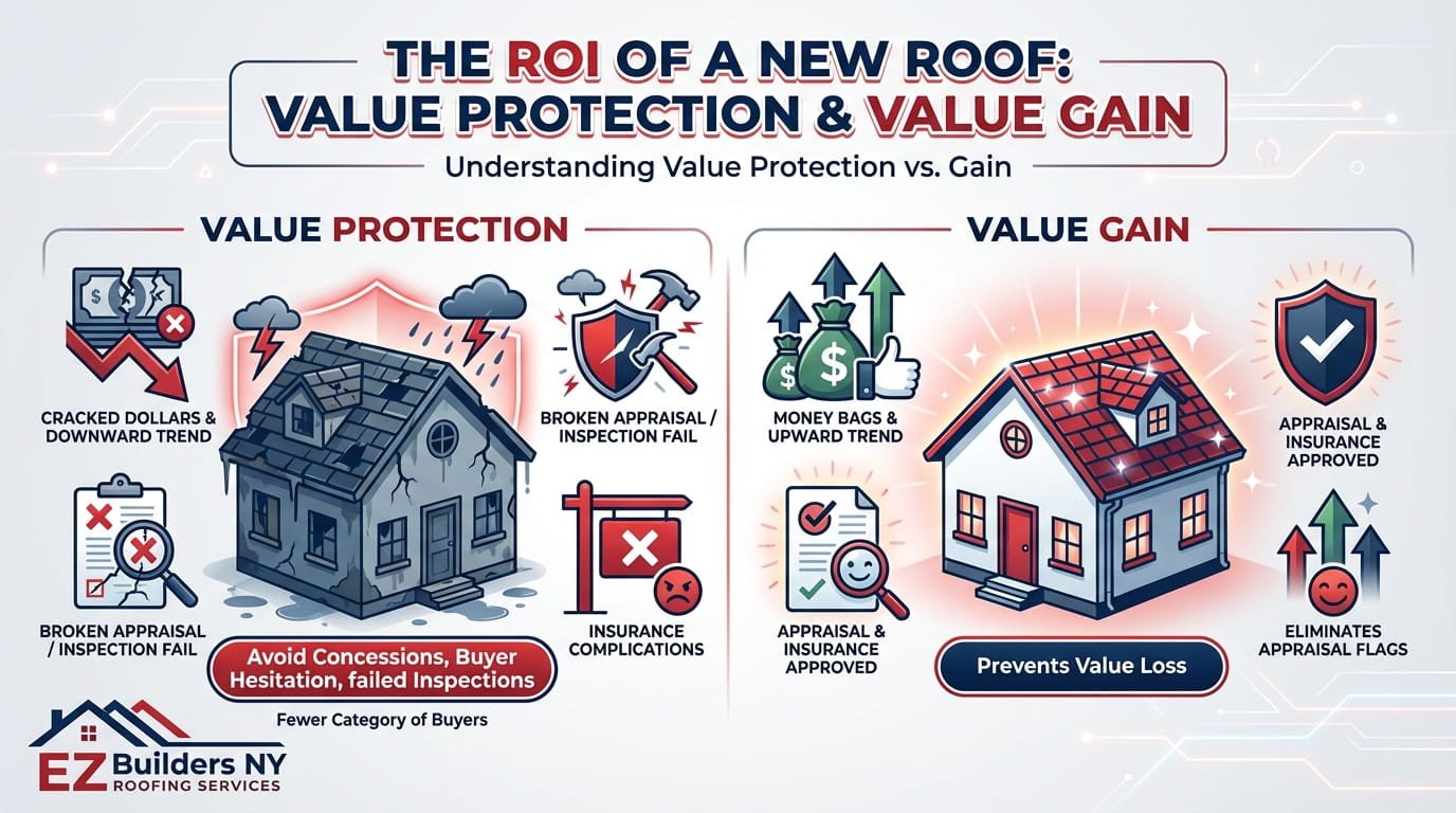 A new roof does three financially important things: it eliminates negative appraisal flags, it removes buyer concession leverage, and it keeps your home insurable. Each of these translates into real dollars, often more than the cost of the roof itself.