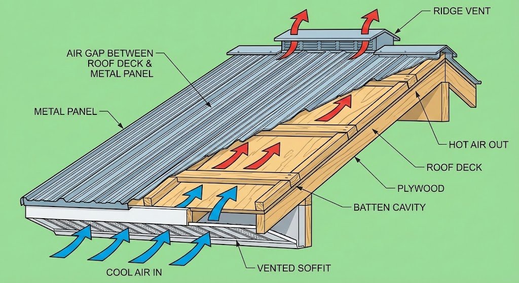 Battens or Purlins are the secret. These are wood or metal strips (typically 1×4 or 2×4) installed vertically from eave to ridge over the roof deck. The metal panels attach to these battens, creating a continuous air channel between the roof deck and the metal.